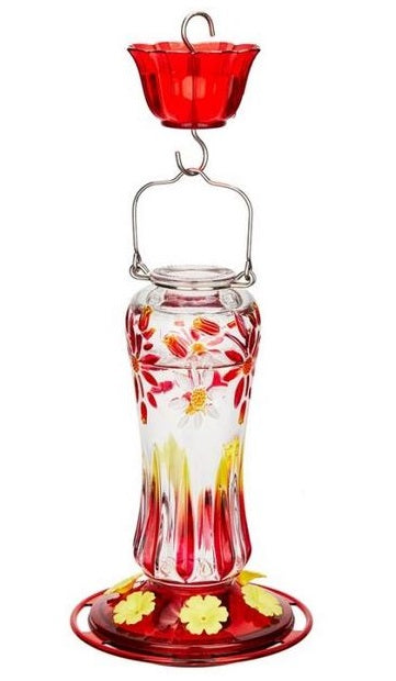 Glass hummingbird feeder with free ant moat and floral motif. 6 feeding ports, 16 oz capacity, large opening for easy filling & cleaning. Flat top for easy inverted filling.
