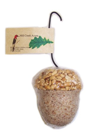Mill Creek Seed Co. The top is our famous peanut cake and the bottom is our very attracting peanut suet. Inside is a natural pine cone as the centre substrate.5" tall x 4" diameter. Made In Canada