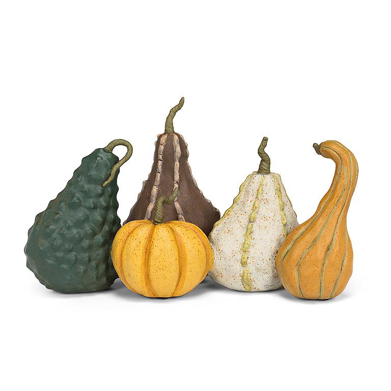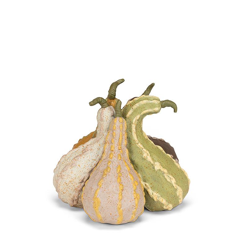 Crafted out of resin, this life-like sculpt of gourds stacked atop one another in warm, autumnal colours makes an elegantly understated seasonal complement to mantles, centrepieces, decorative displays and more. Other decorative gourds also available.