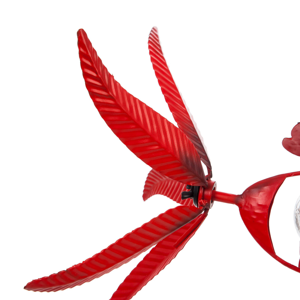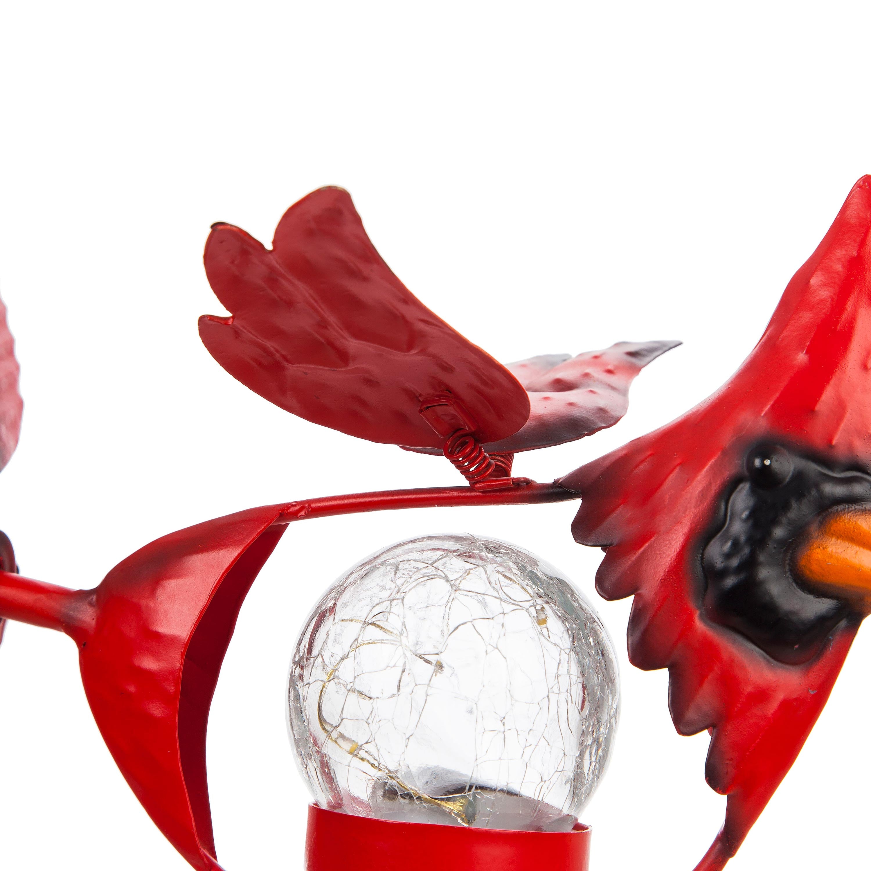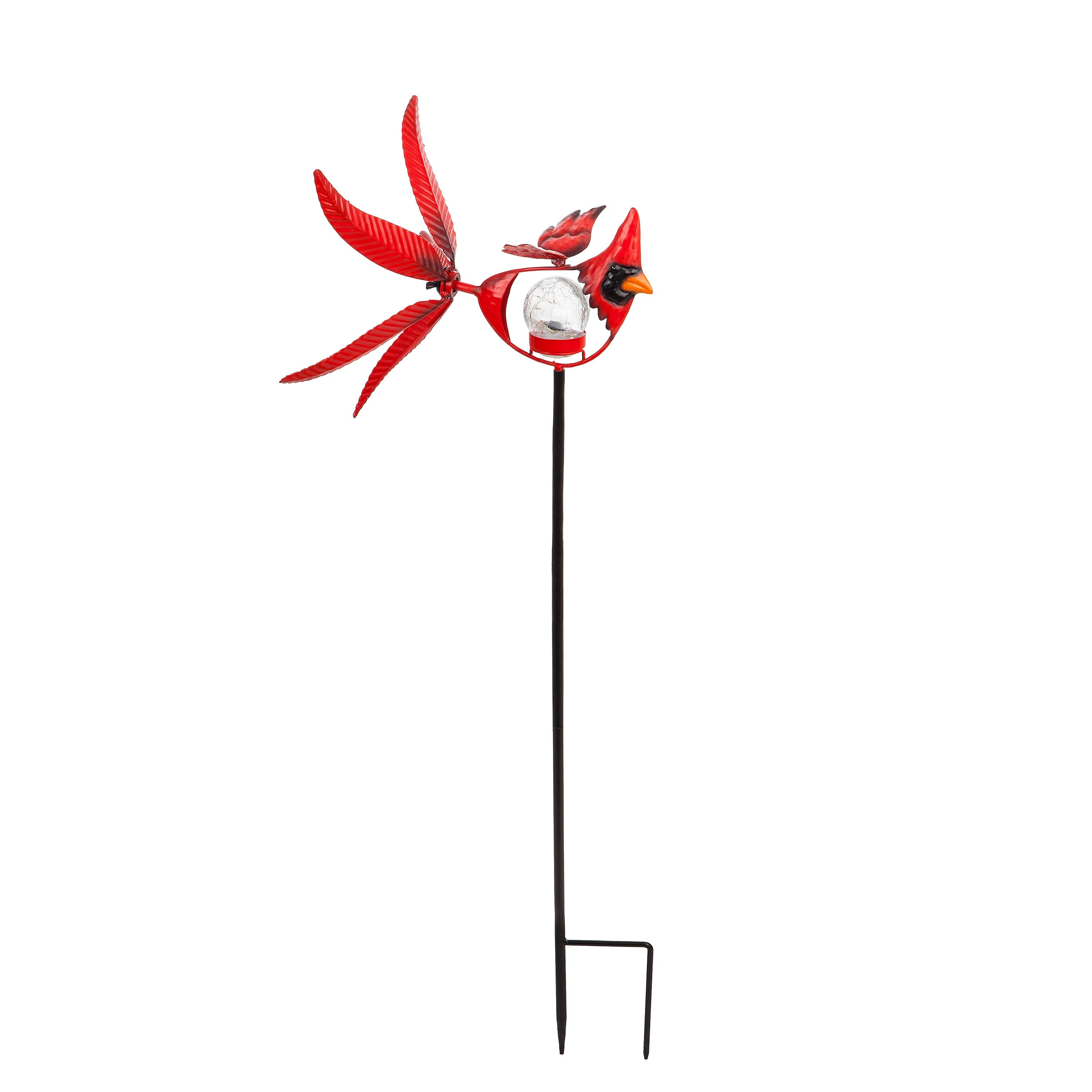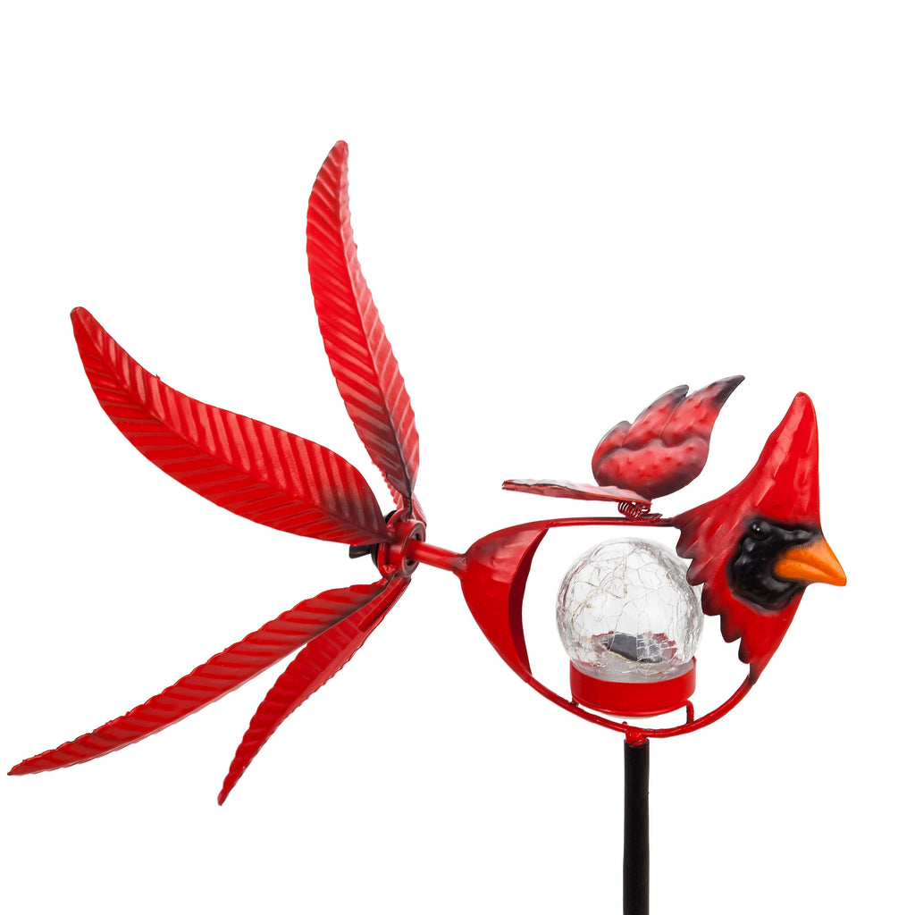 Transform any outdoor space into a stage with the display of this mesmerizing wind spinner. With it's vibrant splendor, the eye-catching design is brought into motion whenever the wind blows. Made of powder-coated metal with a weather- and rust-resistant finish that prevents fading, the stake features a bold red cardinal design that adds color to any area and lights up when the sun goes down. The solar-powered design requires 6-8 hours in direct sunlight for a full charge. Simply push the durable h-stake into damp soil for easy display - no tools are necessary! Wind direction varies on high and low pressure, so there is no optimal direction to place the kinetic. Light assembly is required.