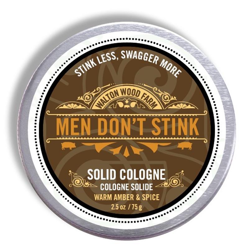 "Men Don't Stink" Solid Cologne - because a man's scent should turn heads, not send people running. Warm Amber & Spice scent. 2.5 oz solid tin is carry-on luggage approved, won't leak or break. INGREDIENTS: Helianthus Annuus (Sunflower) Seed Oil, Hydrogenated Soybean Oil, Cera Alba(Beeswax), Fragrance, Vitis Vinifera (Grape) Seed Oil, Caprillic /Capric Triglycerides, Ricinus Communis (Castor) Seed Oil, Hydrogenated Castor oil, Copernicia Cerifera Wax, Mixed Tocopherols ALLERGENS: Linalool, Limonene, Citral, Benzyl Alcohol